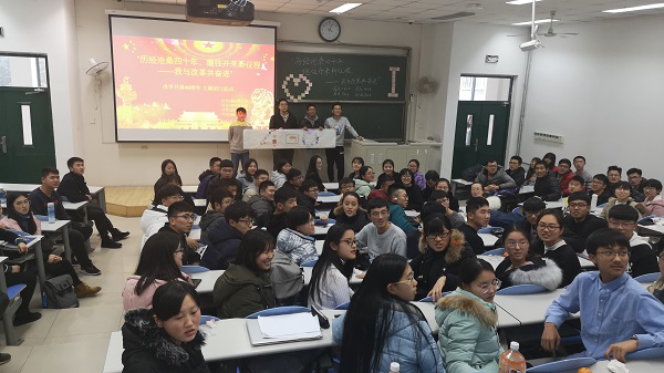 12月22日下午,化学工程学院2018级应用化学与环保设备工程专业于东环204教室举办“历经沧桑四十年,继往开来新征程”主题团日活动,本次活动由四个班级的团支部组织,旨在增强同学们的爱国主义情操,了解青年应要背负的使命,为建设中国特色社会主义社会开启新的征程。
