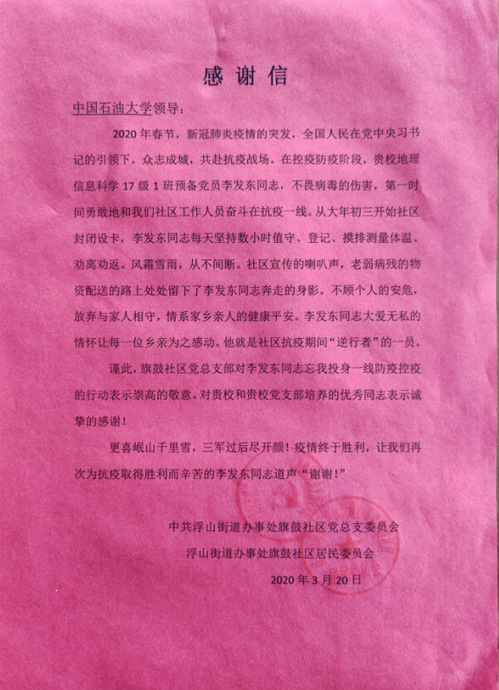 “在控疫防疫阶段,贵校李发东同志,不畏病毒的伤害,第一时间勇敢地和我们社区工作人员奋斗在抗疫一线。他大爱无私的情怀让每一位乡亲为之感动。”这是来自湖北省咸宁市浮山街道办事处旗鼓社区居民委员会的一封感谢信,而信中提到的李发东,是海洋与空间信息学院地理信息科学2017级1班的一名预备党员。