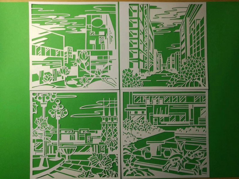 活动期间,学生们对“手工大比拼”活动也展现出了高涨的参与热情。橡皮章版《清明上河图》、印章版“武汉加油”、传统木工弓弩、变形金刚纸模型……参与者们充分发挥自己的特长,展示自己的动手能力,创作出了一份份精美的手工作品。学生们在手工比拼活动中所展示出来的创造力和想象力以及注入在作品中的情感都令人赞叹不已。电气1606班的朱悦茹选取了学校图书馆、校门等四处颇具代表性的景观,搭配玉兰、绣球、法桐等象征四季的植物,用传统剪纸的手法结合现代的简约风格,为石大定制了一款专属纸雕。这份作品展现出的对石大的眷恋和想念引起了无数人的共鸣。