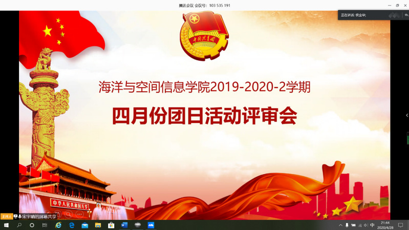 为切实抓好基层团支部建设,激发团组织的创造性和凝聚力,4月25日晚,海洋与空间信息学院组织2019-2020学年第2学期四月份团日活动评审会。此次会议由宋雨晴主持,学院团委组织部部长兼2018级团总支书记侯金华、学院团委办公室主任兼2019级辅导员邓云强、各年级团总支与学生组织代表作为评委出席评审会。