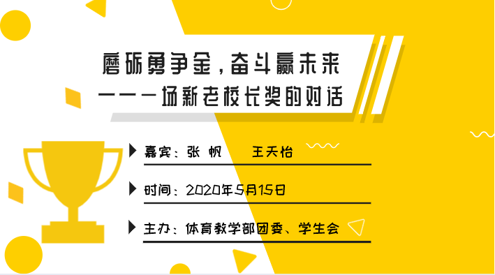 5月15日,体育教学部团委“青春正担当”第一期线上宣讲活动以视频会议方式展开。本期主题为“磨砺勇争金,奋斗赢未来——一场新老'校长奖'的对话”,邀请到校长奖获得者张帆和王天怡担任嘉宾。会议由张立群主持,体育教学部各年级学生参加。