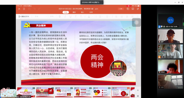 为进一步引导大学生关注两会,深入了解国情与时代发展,学习两会内容,践行两会精神,资源勘查工程1801团支部积极响应学院号召,于5月27日下午两点在线上开展“践行两会精神,奉献青春力量”主题教育活动,资源1801团支部班主任田金强同时参与会议。