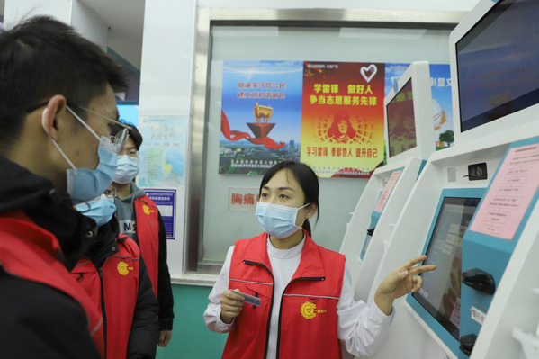 西海岸中心医院工作人员为志愿者培训挂号机使用方法
