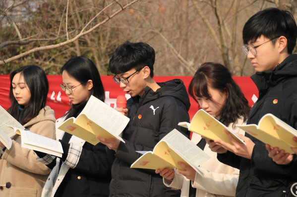 “就在这时,一个新的革命火种却已在沉沉黑夜中点燃起来。从此,在古老的中国大地上出现了完全新式的、以马克思主义为行动指南的、统一的和唯一的中国工人阶级的政党。”3月7日,文法学院团委举办的“读史明智,思源尚美”朗读大会上,学生们集体朗读了《中国共产党简史》,琅琅书声,声声入耳。