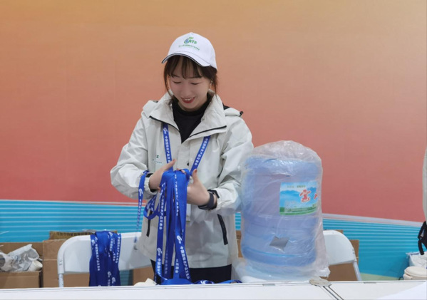 登录厅志愿者为采购商发放通行证 吴雯芮摄