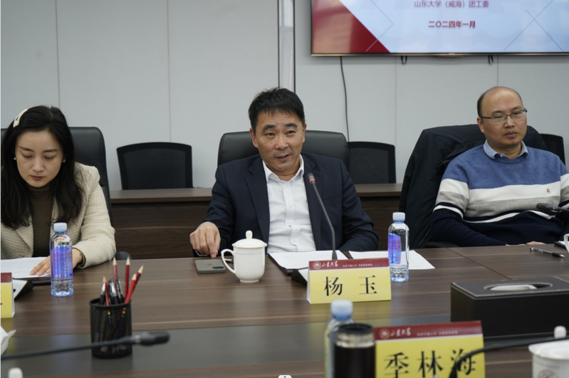 杨玉对季林海一行表示热烈欢迎,介绍了山东大学一校三地办学的基本情况,分享了在山东大学一体发展框架下,威海校区在科技创新、社会实践、团支部建设等方面取得的成绩。他希望双方深化拓展合作领域,进一步挖掘共青团工作的新方法、新模式,推动两校共青团工作再上新台阶。