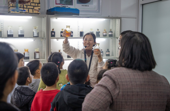 “小科学家”们在地球科学与技术学院于翠玲老师的讲解下,首先参观了石油展区。于翠玲老师向他们展示了原油、沥青、煤油和汽油等样品。通过仔细观察、闻嗅石油等方式,孩子们对石油的多样性、物理特性等有了初步的认识。