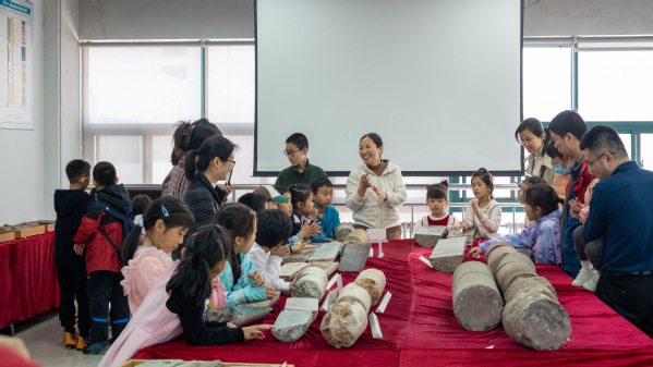在岩心观察环节,“小科学家”们仔细观察了不同地层岩心的特征,并认真思考、积极提问,和父母一起讨论。随后在于翠玲老师指引下一起探寻了化石的印记,恐龙蛋化石、无盾龟化石等珍贵展品让他们惊叹不已。