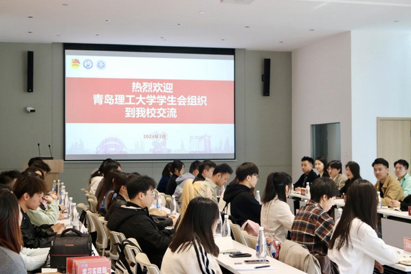 活动伊始,两校学生会组织进行座谈交流,对各自工作经验与所开展的特色活动做交流分享。青岛理工大学学生会主席团成员胡宝艳首先分享了该校学生会建设的基本情况以及主要品牌活动“超级演说家”的组织情况。青岛理工大学研究生会主席团成员王柯涵重点围绕该校志愿者团队的建设经验展开分享。我校学生会主席团成员晋婕婷以我校学生会“荟萃青年”品牌系列活动为例,总结汇报了我校“我为同学做实事”的项目成果。我校研究生会主席团成员祁顺鑫就我校研究生会过去一年的主要工作内容做交流汇报,并就“锦囊”系列特色活动进行分享。
