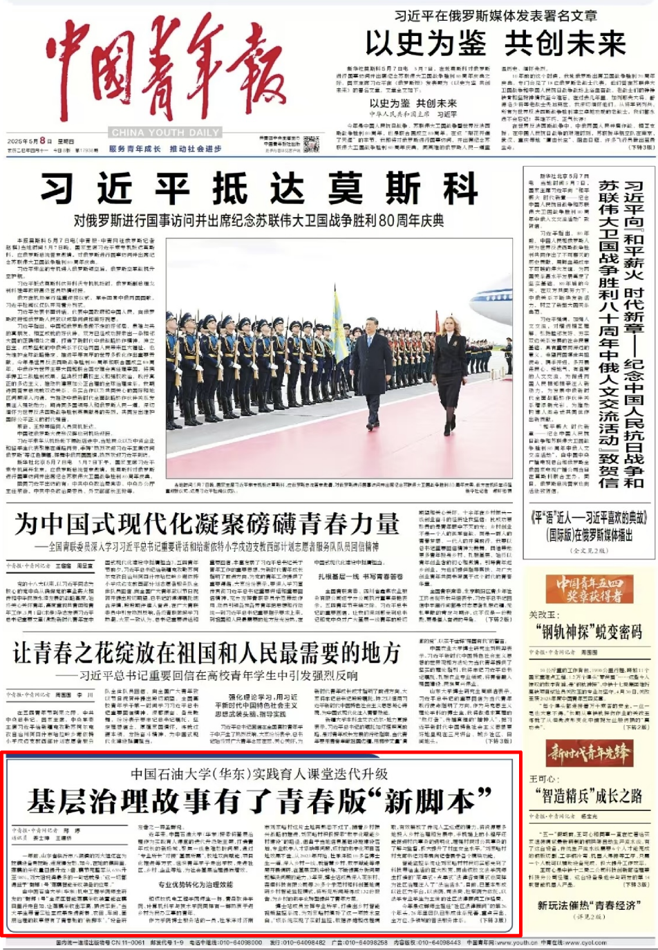 青年是基层治理的生力军、主力军,更是‘创力军’。近年来,中国石油大学(华东)探索将基层治理作为实践育人课堂的迭代升级版主题,打造青年成长的新场域,聚焦一线急难愁盼问题,通过“专业所长”对接“基层所需”、校地双向赋能、项目化推进等方式,组织青年学子走出学校,走进社区、乡村、企业等地,为社会基层治理提质增效。5月8日,《中国青年报》头版以“中国石油大学(华东)实践育人课堂迭代升级,基层治理故事有了青春版‘新脚本’”为题聚焦报道我校基层治理工作典型做法。